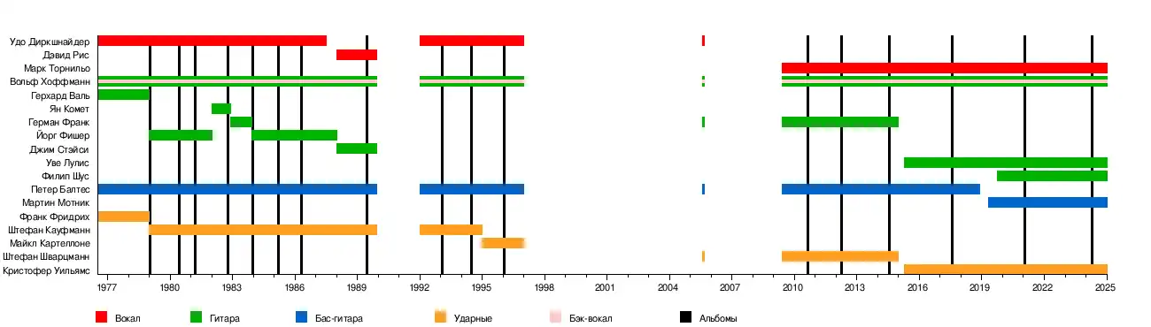 Более или менее стабильный состав группы образовался только в 1975 году, и состоял из Диркшнайдера (вокал), Вольфа Хоффманна (гитара), Герхарда Шталя (гитара), Дитера «Руби» Рубаха (бас) и Франка Фридриха (ударные). В 1976 году группу покинул басист и на его место пришёл Петер Балтес. Интересно то, что изначально он был басистом вовсе не по призванию, а по воле случая — в той группе, где он играл было три гитариста, и на басу не хотел играть никто. Вопрос решили простым способом — Петер Балтес вытянул короткую спичку.