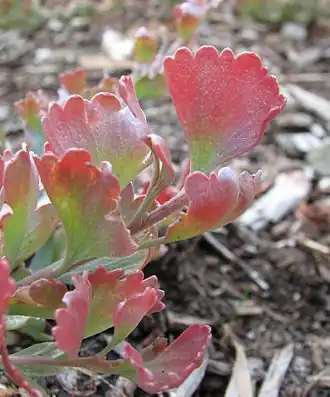 - Coral Carpet («Коралловый ковёр») — стелющаяся форма, пики которой достигают около 20 см в высоту и распространяются до 1,5 м в поперечнике. Новая листва розовато-пурпурного цвета. Случайный саженец сорта Coral Drift, он был первоначально выведен Джорджем Луллфицем из питомника Луллфитц в пригороде Перта Ваннеру. Сорт широко выращивается с 2005 года[41].