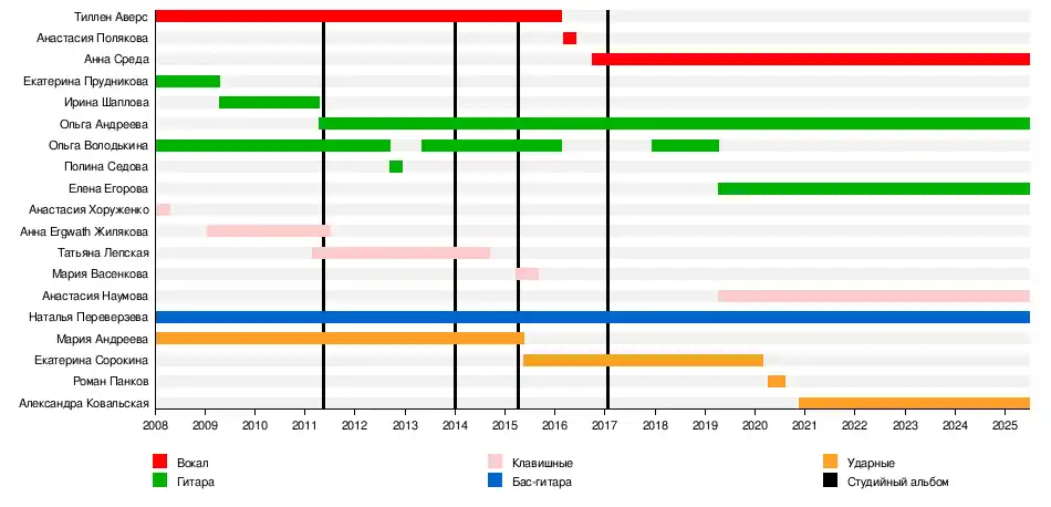 - Ольга Володькина — гитара (2008—2012, 2013—2016, 2017—2019, 2022—наши дни)