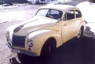 Henk Hoogeveen, vítěz z Le Mans 1950, s cestovním Minorem na okruhu Zandvoort v Holandsku (1949)