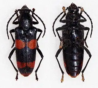 Голова блестяще-чёрная немного уже груди. Усики чёрные не длиннее половины длины тела. Ширина груди в два раза уже ширины надкрылий. Надкрылья чёрно-фиолетовые с красными перевязями[3].
