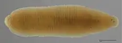 Окраска тела в фиксированном состоянии бежевая, у живых особей, вероятно, более интенсивная, желтовато-коричневая до коричнево-зелёной. Края тела прозрачные. По спинной стороне проходит порядка 30 очень узких, местами прерывистых, тёмных продольных полос, хорошо заметных при подсветке особи.