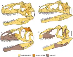 ![]() Скелетная реконструкция голотипа (известный материал показан белым) | |||||||||||||||||||||||||||||||||||||||||