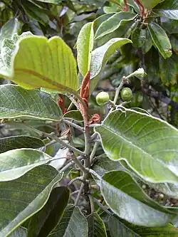 Листья очерёдные, обратнояйцевидные, 5—15 см длиной, голые, блестящие, сверху зелёные, снизу с ржаво-коричневыми жилками. Черешки листьев 13—25 мм длиной.