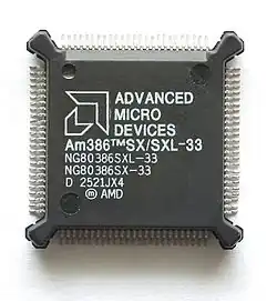 В 1991 году AMD также представила усовершенствованные версии процессора 386SX - опять же не как второй источник производства чипа Intel, а как версию, совместимую по выводам с обратной инженерией. Фактически, это был первый выход AMD на рынок x86, если не считать второго источника для Intel. Процессоры AMD 386SX были доступны с более высокими тактовыми частотами в то время, когда они были представлены, и все еще дешевле, чем Intel 386SX. Изготовленные по технологии 0,8 мкм и использующие статическое ядро, их тактовая частота может быть снижена до 0 МГц, потребляя всего несколько мВт. Энергопотребление было на 35 % ниже, чем у Intel, и даже ниже, чем у 386SL, что делает AMD 386SX идеальным чипом как для настольных, так и для мобильных компьютеров. Версии SXL отличались расширенными функциями управления питанием и потребляли еще меньше энергии.
