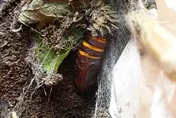 Куколка коричневого цвета. На брюшке имеется несколько ярко-оранжевых колец. В день вылупления бабочки из куколки кольца становятся более заметными.