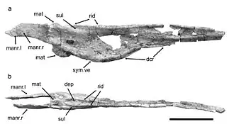 Верхняя поверхность симфиза ограничена тупыми внешними краями (в отличие от острых краёв Thalassodromeus[5][6]), разделёнными узкой впадиной. Эта впадина становится вогнутой в задней части челюсти, и она окружена парой хорошо развитых гребней, отставленных от фактических внешних краёв, что необычно, поскольку у прочих известных представителей группы этого не наблюдается. Гребни отделены от внешних краёв узкими углублениями. Большинство других беззубых птерозавров имеют простую уплощённую или вогнутую поверхность. В задней части симфиза имеется неглубокая ямка, которая заканчивается двумя сегментами, как у Caupedactylus и Quetzalcoatlus[1][4].