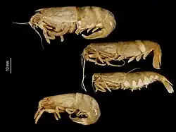 Карапакс без надглазничного шипа. Тельсон с заднебоковыми углами, нависающими над задним краем. Глаза пигментированы, не дегенерированы. Переоподы без экзопод, 2-я пара с карпусом глубоко выемчатая, мало или совсем не длиннее ширины[1].