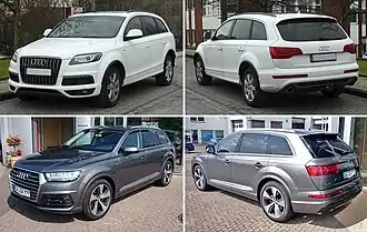 По сравнению с предшественником Q7 4M стал немного меньше, и на 325 килограммов легче для удобства парковки и проезда по узким дорогам[22]. Как и в первом поколении, есть комплектации с семью местами. Q7 второго поколения доступен с тремя видами фар: ксеноновые, Led и Matrix Led[23].