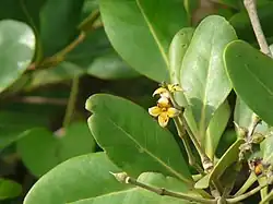 Толстые кожистые листья длиной от 4 до 12 см и шириной от 2 до 6 см. Форма листьев от яйцевидной до широкоэллиптической и обратнояйцевидной с закруглённой верхушкой и заострённым или округлым основанием. Края листа слегка загнуты вниз. Верхняя сторона листа ярко-зеленая и голая, нижняя — с мелкими серо-зелёными волосками.