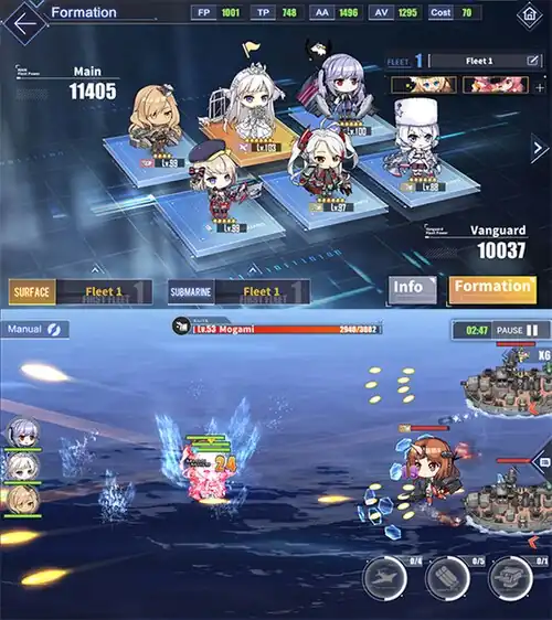 Сверху — выбор кораблей для сражения (Верхний ряд — основной флот. Слева направо: USS Nevada, USS Enterprise, USS Essex. Нижний ряд — авангард. Слева направо: Z23, Prinz Eugen, «Аврора»).