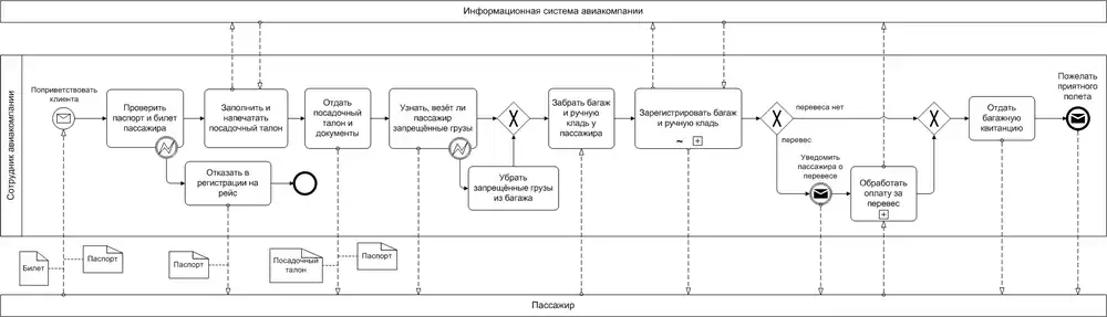 Если паспорт и билет в порядке, то сотрудник авиакомпании регистрирует клиента на рейс и распечатывает посадочный талон. При этом он взаимодействует с информационной системой авиакомпании. Сотрудник отдаёт пассажиру посадочный талон и паспорт, после чего уточняет, нет ли в багаже пассажира запрещённых грузов (например, воспламеняющихся веществ). Если таковые есть, то они изымаются из багажа. Сотрудник авиакомпании забирает багаж и ручную кладь пассажира и регистрирует её. При этом сотрудник снова взаимодействует с информационной системой авиакомпании. Если выясняется, что есть перевес, то сотрудник уведомляет об этом пассажира и сообщает сколько необходимо заплатить. После получения денег от пассажира, сотрудник регистрирует оплату в системе.