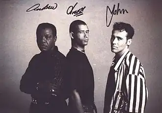 ![]() «Золотой» состав Bad Boys Blue (1984—1989). Участники (слева направо): Тревор Тэйлор, Джон МакИнерни (передний план) и Эндрю Томас (задний план) | |