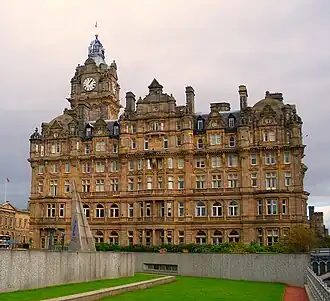Расположенный близ главного вокзала Эдинбурга, отель Balmoral по-прежнему пользуется спросом у путешественников. Чтобы они приходили вовремя к отправлению поезда, часы на башне отеля, заметные и с большого расстояния, традиционно спешат на две минуты. Высота башни составляет 58 м. Здание отеля выполнено в викторианском стиле с вкраплениями шотландского баронского стиля. Во время модернизации с фасада здания были убраны практически все декоративные балкончики.