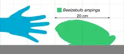 Beelzebufo ampinga, возможно, была самой большой лягушкой из всех когда-либо существовавших: она достигала 41 см в длину (со сложенными ногами) и весила предположительно 4,5 кг[2][3][4], в то время как размеры самой крупной из живущих ныне лягушек, лягушки-голиафа, составляют лишь 32 см и 3,3 кг соответственно[5]. У Beelzebufo были мощное телосложение, короткие ноги и очень широкий рот с мощными челюстями[3]. Поскольку ближайшими современными родственниками Beelzebufo являются южноамериканские лягушки-рогатки[2], она, вероятно, также могла иметь рога на голове[3].