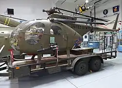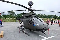 Bell OH-58 Kiowa — семейство однодвигательных военных вертолетов, в основном используемых для наблюдения, связи и непосредственной огневой поддержки. Основной задачей оригинального OH-58A было целеуказание для других средств огневого поражения, таких как ударный вертолет Bell AH-1 Cobra или для подразделений наземной артиллерии. Он не имел никакого вооружения и весил 1451 кг при полной загрузке, имея возможность перевозить небольшое количество груза или до двух пассажиров[10]. В то время как первые версии зависели от экипажа в проведении разведки и наблюдения за полем боя, более поздние модели были оснащены сложными оптико-электронными системами и датчиками для более точного целеуказания. На более поздних вариантах OH-58 грузоподъемность также была значительно увеличена, в частности, OH-58D Kiowa был разработан для перевозки грузов в 2495 кг, что на 72% больше, чем у оригинальной версии[10].