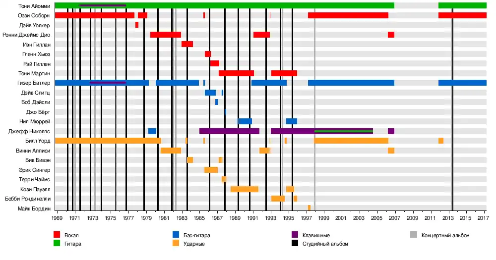 Лидером и основным композитором Black Sabbath был гитарист Тони Айомми, вторым почти неизменным участником и соавтором песен — басист Гизер Батлер. Остальной состав группы неоднократно менялся. Альбомы до 1980 года записаны классическим составом с вокалистом Оззи Осборном. После расставания с ним на различных альбомах группы пели Ронни Дио, Тони Мартин и другие вокалисты. В 2011 году группа воссоединилась в классическом составе, а в 2017 году после прощального тура завершила выступления окончательно[6][7]. Участники Black Sabbath, в особенности Оззи и Дио, также сделали успешные сольные карьеры после ухода из группы.