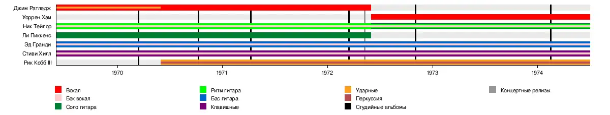 - Уоррен Хэм – ведущий вокал, гармоника, саксофон, флейта (1972–1974)