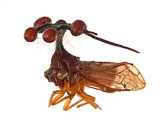 Мелкие равнокрылые насекомые (около 5 мм) с большим разветвлённым спинным отростком на груди. От близких видов отличается следующими признаками: стебелёк переднего шаровидного вздутия (луковицы) грудного отростка короткий (менее 0,5 диаметра передней луковицы); боковая луковица грудного отростка заметно больше передней; боковой шип грудного отростка короче или примерно равен диаметру боковой луковицы при виде сверху; боковая луковица равна или больше передней; центральная дорсальная ножка переднеспинки перпендикулярна оси тела при виде сбоку, не наклонена назад; боковая ветвь переднеспинки медиально расширена в одиночный луковидный выступ-вздутие, который может быть веретеновидным, эллипсовидным или сферическим (всего их четыре); передняя луковица заметно меньше боковой; передние луковицы стебельчатые. Дорсальная вершина центральной ножки переднеспинки расширена в луковидный выступ[1][3][2][4].
