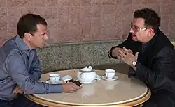 24 августа 2010 года в городе Сочи состоялась встреча Боно с президентом России Дмитрием Медведевым[19]. Во время встречи Медведев, в частности, сказал певцу: «Когда очень много начинают заниматься общественной деятельностью, зачастую музыка заканчивается, но с Вами этого не случилось»[20].