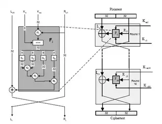 1. (развертка ключа) составляет 16 пар подключей {Kmi, Kri} полученных из K (см. разделы Пары раундовых ключей и Неидентичные раунды).