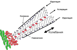 (1) Притягивает ткань к вибрирующему наконечнику и создаёт эффект взаимодействия между наконечником и тканью. (2) Удаляет ирригационную жидкость и фрагментированную ткань с операционного поля.
