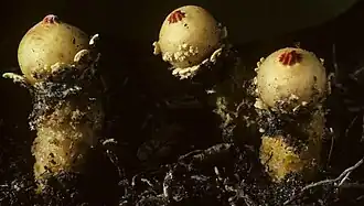 Перидий: Экзоперидий слегка студенистый, по мере роста гриба разрывается вместе с мезоперидием, образуя кольцо в нижней трети плодового тела. Мезоперидий тонкий, бледно-жёлтый. Эндоперидий гладкий, твёрдый, тонкий, тускло-жёлтый; с апикальным отверстием, окруженным красной звездообразной (с 5—8 лучами)[4] перистомой.