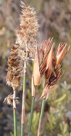 Многолетнее травянистое растение, для которого характерны прутьевидные стебли. Корневища ползучие, длинные. Высота стеблей обычно до 1 м. Семя представляет собой орехообразный плод с одним семенем.