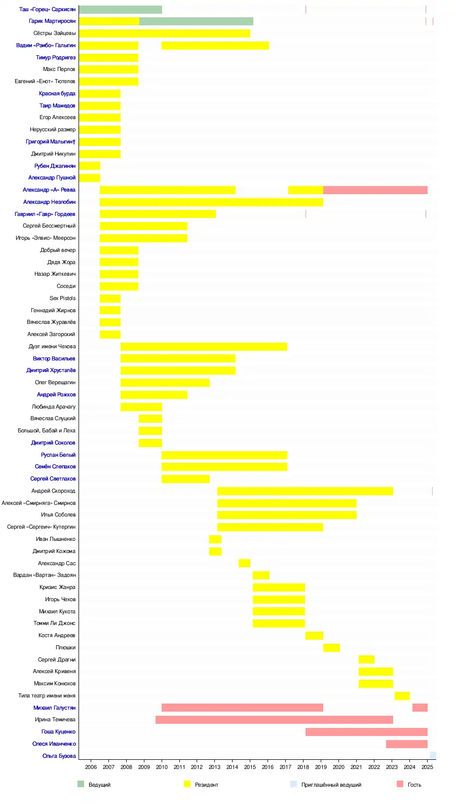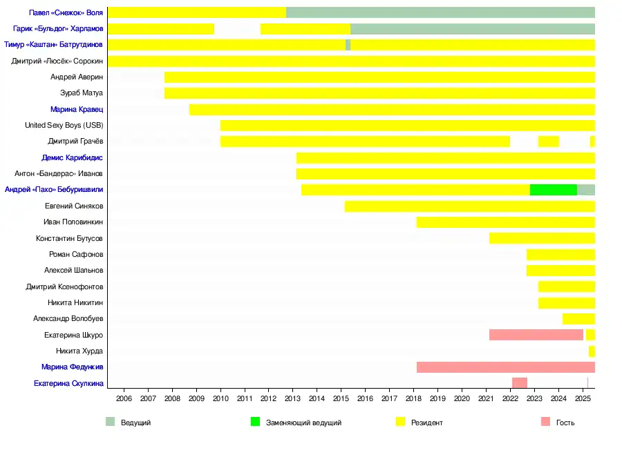 Таш Саркисян (2005—2010) Павел Воля (с 2010) Гарик Мартиросян (2010—2015) Тимур Батрутдинов (2015) Гарик Харламов (с 2015) Андрей Бебуришвили (с 2022) |
