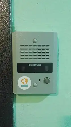 Наклейка с логотипом сети на квартирном домофоне