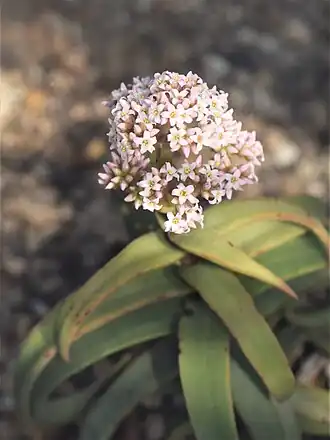 Соцветие округлое с сидячими цветками; цветонос длиной 10–30 мм. Чашечка: доли ланцетные, 2–3 мм длиной, голые или иногда с широко расставленными заостренными краевыми зубцами, мясистые, коричневые. Венчик трубчатый, сросшийся в основании, белый или кремовый. Тычинки с черными пыльниками. Чешуйки продолговатые, 0,6—0,8 х 0,3—0,4 мм, почти усеченные, постепенно сужающиеся к основанию, мясистые, желтые[4]. Время цветения: ноябрь – декабрь[5].