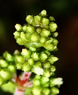 Цветки собраны в округлые или немного удлиненные соцветия, включающие небольшое количество шаровидных дихазий. Длина цветоноса составляет 0,08-0,15 метра, и он становится голым к моменту полного созревания. Чашечки обычно продолговато-треугольные, длиной 1-1,5 мм, с опушенными или голыми поверхностями, имеют мясистую текстуру и зеленоватый цвет. Венчик цветка трубчатый или почти цилиндрический, основание его слегка сросшееся на 0,3-0,5 мм, окраска может варьироваться от кремовой до бледно-желтой. Лепестки венчика обратно-ланцетно-пандуриформные, длиной 2-3 мм, с удлиненно-эллипсоидным или почти шаровидным придатком на дорсальной стороне и короткой перепончатой вершиной внутри. Тычинки обычно имеют желтые пыльники[3].