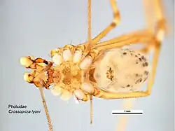 Домен: Царство: Подцарство: Без ранга: Без ранга: Без ранга: Без ранга: Тип: Подтип: Класс: Отряд: Подотряд: Инфраотряд: Клада: Серия: Haplogynae Надсемейство: Pholcoidea Семейство: Род: Вид: Crossopriza lyoni |
