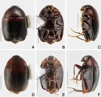 Мелкие жесткокрылые: длина тела от 2,53 до 2,78 мм. От близких видов отличаются следующими признаками: переднеспинка, гипомерон и щитик красновато-коричневые; надкрылья чёрные, передняя часть красновато-коричневая; гипомерон и мезанэпистернум с бороздчатой микроскульптурой; метавентрит гладкий, над межтазовыми пластинками в грубой пунктировке. Метанеэпистернум и метэпимерон с черепитчатой микроскульптурой. Вершина эдеагуса длинная, парамеры удлинённые, во внутреннем мешке слабые склериты. Дистальные гонококситы прямые и тонкие. Блестящие, коричневато-чёрные, лапки светлее. Надкрылья покрывают все сегменты брюшка, кроме нескольких последних. Формула члеников лапок: 5—5—5. Микофаги, собраны на грибах Psathyrella candolleana (Агариковые, Псатирелловые), Xylodon flaviporus (Гименохетовые, Schizoporaceae) и на Шампиньоне лесном (Agaricus sylvaticus)[1][2].