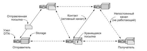 Посылка — сообщение. Посылки хранятся в узлах DTN до тех, пока нужный канал не активизируется; затем происходит отправка посылок. Каналы работают с перерывами.
