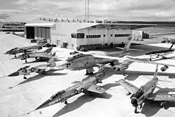 1958 год. В кадре два опытных «двухмаховых» истребителя с БРЛС — соперников Mirage III из США за заказ истребителя-бомбардировщика NATO и Швейцарии: Grumman F11F-1F Super Tiger (слева третий) и Lockheed YF-104 Starfighter (в центре снизу)