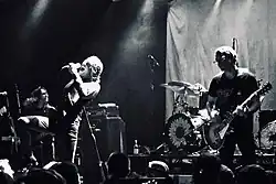 ![]() Deafheaven в Копенгагене в 2017 году. Слева направо: Шив Мехра, Крис Джонсон, Джордж Кларк и Керри МакКой, на заднем плане Дэниел Трейси. | |