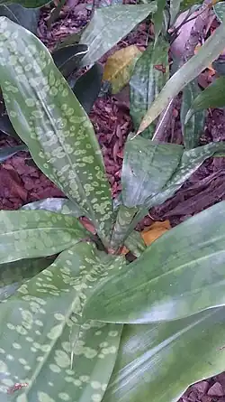 Листья этого вида овальные, имеют множество светло-зелёных пятен[2].