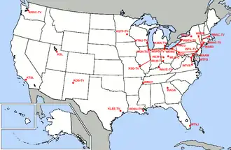 Вскоре после того, как его экспериментальная станция в Вашингтоне подписала контракт, ДюМонт начал экспериментальное подключение коаксиальным кабелем между своими лабораториями в Пассейке и двумя телестанциями.[9] Регулярное сетевое обслуживание началось 15 августа 1946 года на WABD и W3XWT. В ноябре 1946 года W3XWT получила первую в столице коммерческую лицензию под названием WTTG.[11] К этим двум станциям, принадлежащим и управляемым DuMont, 11 января 1949 года присоединилась WDTV (канал 3) в Питтсбурге.[12]