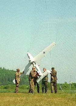 Запускается с помощью катапульты [1], приземление происходит с помощью специального парашюта или в натянутую сеть.