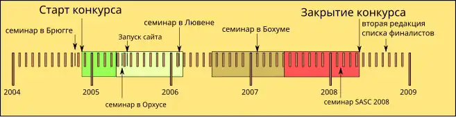 | 14-15 октября 2004 | Семинар, организованный ECRYPT в Брюгге. «SASC — The State of the Art of Stream Ciphers» (Современное состояние потоковых шифров)[2]. В результате обсуждения на этом семинаре было решено организовать конкурс. |