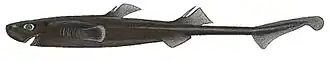 Максимальный зарегистрированный размер составляет 21,2 см. Тело вытянутое, с удлинённым и тонким хвостовым стеблем. Голова закруглена, её длина составляет 5,7—7,5 % от длины тела. Передняя часть тела почти цилиндрической формы, сильно сужается к хвосту. Тело покрыто мелкими плакоидными чешуйками, за исключением губ, границ жаберных щелей, области вокруг клоаки и дорсальной поверхности птеригородий. Крупные овальные глаза вытянуты по горизонтали. Позади глаз имеются крошечные брызгальца. Ноздри размещены на кончике рыла. У основания обоих спинных плавников расположены шипы. Анальный плавник отсутствует[1].