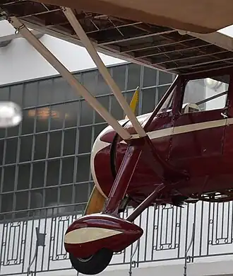 Двухлучевой V-обра́зный[ком 3] подкос исходил из нижней части фюзеляжа (под передней частью двери) и крепился концами к середине крыла — концы располагались друг за другом параллельно фюзеляжу, в передней и задней части крыла (прямо возле начинавшегося элерона — у его конца ближнего к фюзеляжу).