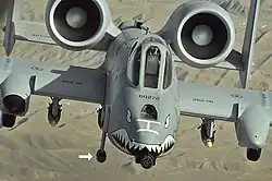 A-10 Thunderbolt II в операции непосредственной авиационной поддержки, Афганистан, 2008 год. Лазерный датчик Pave Penny (по стрелке). Двухкилевое оперение экранирует тепловое и акустическое излучение двигателей (реактивных струй), расположенных в хвостовой части над фюзеляжем.