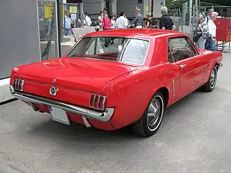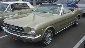 Первый Mustang покинул конвейер утром 9 марта 1964 года, а к концу этого же года было продано 263 434 машины[6][7]. В качестве основы для дизайна Mustang был использован стилистический «ключ» люксового купе Continental Mark II середины пятидесятых годов — с характерными пропорциями с длинным капотом и коротким багажником и пластикой боковины кузова с изломом над аркой заднего колеса.