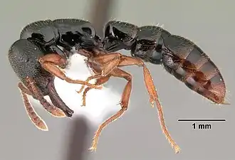 Относительно крупные для своего рода земляные муравьи (длина рабочих 4—6 мм, самок около 6 мм) с длинными узкими мандибулами и хорошо развитым жалом. От близких видов отличаются следующими признаками: дорсум головы сильно скульптурирован до вершинного уровня; медиальные клипеальные бугорки разделены. Заднебоковые углы проподеума без бледного пятна. Метанотальный шов отсутствует. Мезосома уже головы. Ноги короткие. Передний край клипеуса зубцевидный; петиоль очень широко прикреплён к 3-му абдоминальному сегменту и без отчётливой задней поверхности; постпетиоль отсутствует[2][3].