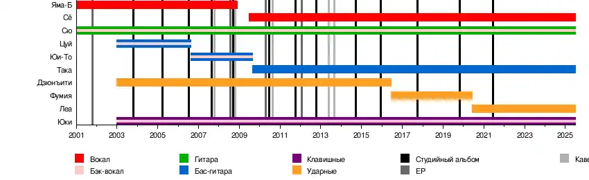 ![]() Выступление Galneryus в Мексике в 2016 году. Слева направо: Юки, Така, Сё, Фумия, Сю | |
