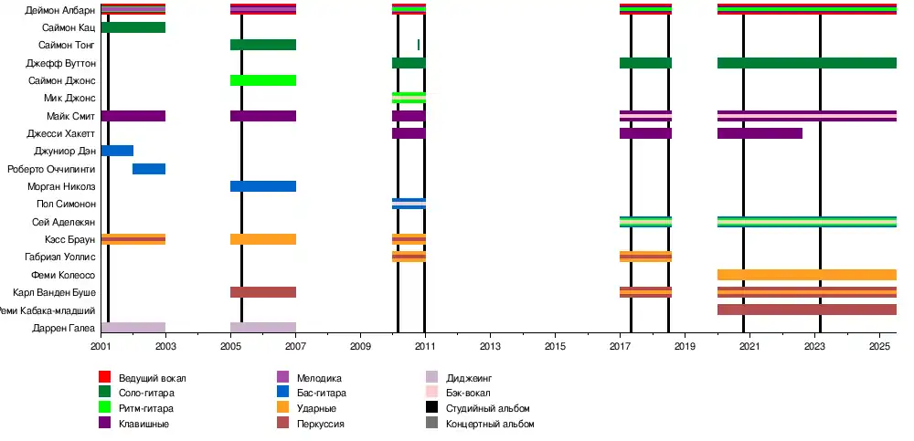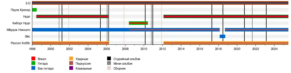 Виртуальный состав: Мёрдок Никкалс 2-D Рассел Хоббс Нудл Реальный состав: Деймон Албарн Джейми Хьюлетт Реми Кабака-младший |