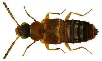 Мелкие коротконадкрылые жуки. Длина тела от 1,7 до 2,1 мм, форма узкоовальная. Пронотум в 1,4 раза шире своей длины. Окраска желтовато-коричневая. Обнаружены с июня по сентябрь в смешанных лесах. Личинки и взрослые жуки питаются грибами (облигатные микофаги), в которых живут, питаются и размножаются, откладывают яйца. Поедают споры, базидии и гифы грибницы[1]. Голова широкая, сильно поперечная. Глаза относительно крупные, выступающие (за глазами голова суженная). Язычок длинный и узкий. Губные щупики 2-члениковые. Переднеспинка уже надкрылий. Задние лапки 5-члениковые, а лапки передних и средних состоят из 4 сегментов (формула лапок: 4-5-5)[3].