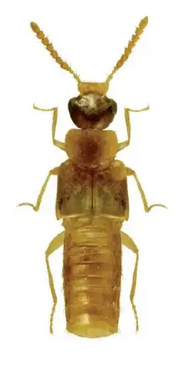 Мелкие коротконадкрылые жуки. Длина тела от 1,8 до 2,0 мм, форма узкая, субпараллельная. Пронотум в 1,5 раза шире своей длины. Окраска головы рыжевато- и желтовато-коричневое. Обнаружены с августа по октябрь в смешанных лесах. Личинки и взрослые жуки питаются грибами (облигатные микофаги), в которых живут, питаются и размножаются, откладывают яйца. Поедают споры, базидии и гифы грибницы[1]. Голова широкая, сильно поперечная. Глаза относительно крупные, выступающие (за глазами голова суженная). Язычок длинный и узкий. Губные щупики 2-члениковые. Переднеспинка уже надкрылий. Задние лапки 5-члениковые, а лапки передних и средних состоят из 4 сегментов (формула лапок: 4-5-5)[3].
